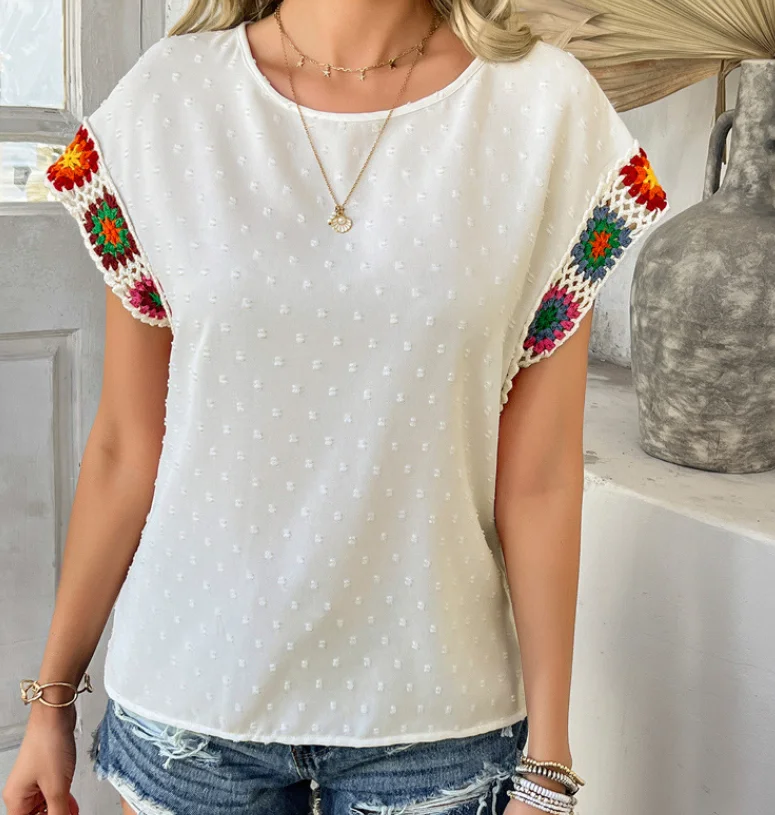 New Fashion 2025 Summer Casual Casual Color Blocking Vacation Polka Dot Embroidered Short Sleeved Top Shirt Women’s Clothing