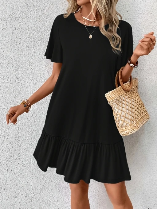 Women's fashionable casual round neck short sleeved solid color mid waist dress for spring and summer 2025 new women's clothing
